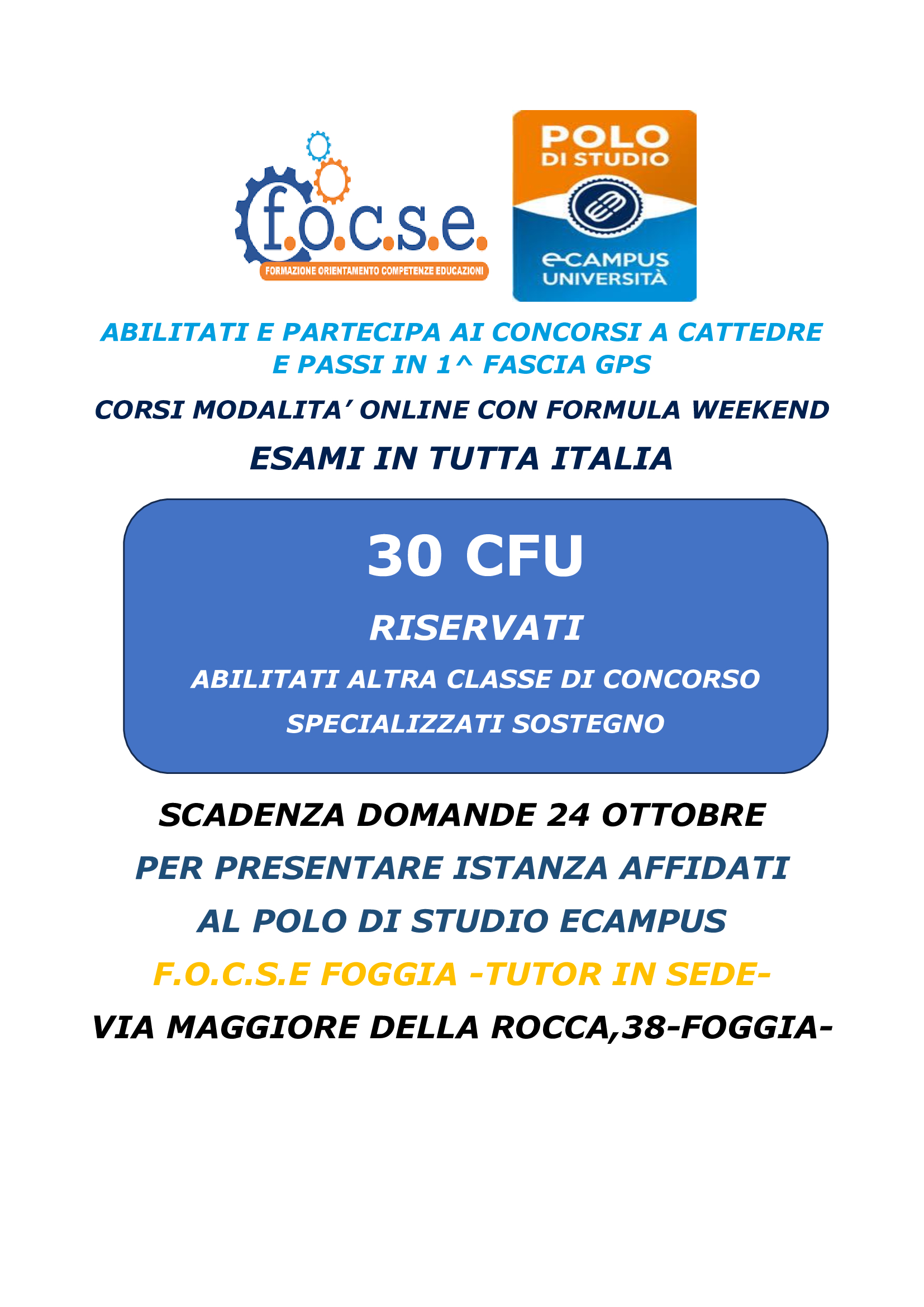 CORSI ABILITANTI DA 30 CFU: ISCRIZIONI SINO AL 24 OTTOBRE 2025- CONVENZIONE CON POLO DI STUDIO FOCSE/UNIVERSITA’ E-CAMPUS-FOGGIA