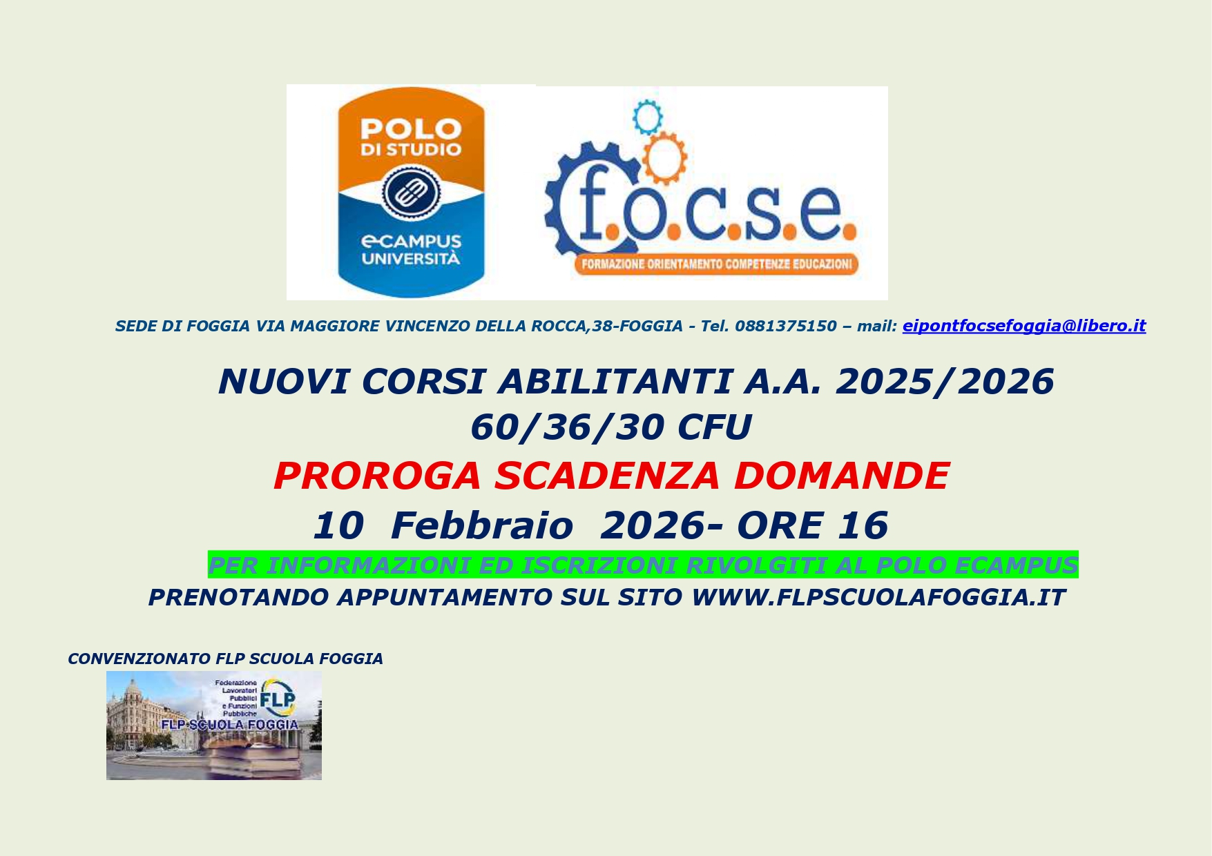 TUTTI COLORO CHE SONO INTERESSATI AD OTTENERE CHIARIMENTI E ISCRIZIONI AI CORSI POSSONO RIVOLGERSI PRESSO LA NOSTRA SEDE IN VIRTU’ DELLA CONVENZIONE STIPULATA CON FOCSE – FOGGIA – POLO DIDATTICO E-CAMPUS CHE PREVEDE LA PRESENZA DI UN TUTOR UNIVERSITARIO PRESSO LA SEDE FLP SCUOLA FOGGIA