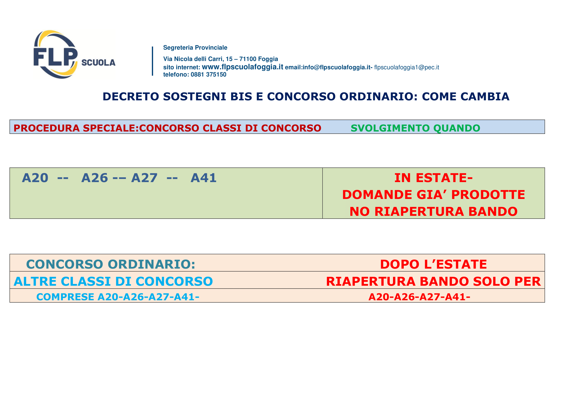 - Viene prevista una semplificazione generale di tutte le procedure concorsuali ordinarie, per tutte le classi di concorso (comprese le classi di concorso A-20, A-26, A-27 e A-41). Queste procedure concorsuali si svolgeranno presumibilmente dopo l’estate.