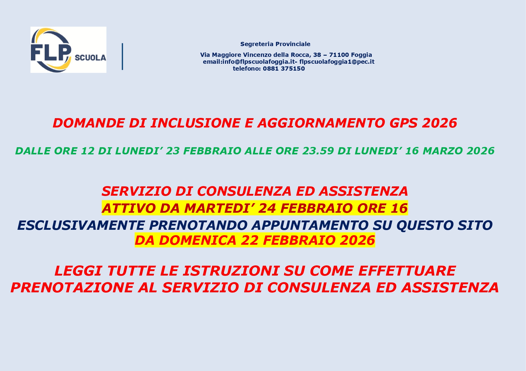 • IL SERVIZIO DI CONSULENZA ED ASSISTENZA SI SVOLGE SOLO IN PRESENZA, SOLO PER COLORO CHE SONO IN EFFETTIVO SERVIZIO IN ALTRA PROVINCIA, E SONO ISCRITTI ALLA FLP SCUOLA FOGGIA, POTRA’ ESSERE EFFETTUATA CONSULENZA ED ASSISTENZA TELEFONICA O VIA WEB. IN TAL CASO, GLI INTERESSATI DOVRANNO INVIARE APPOSITA MAIL A INFO@FLPSCUOLAFOGGIA INDICANDO ALCUNI GIORNI IN CUI SI DESIDERA ESSERE CONTATTATI, E I RELATIVI ORARI.. SARA’ CURA DELLA NOSTRA SEGRETERIA COMUNICARE IL GIORNO E ORA IN CUI I NOSTRI ADDETTI SARANNO DISPONIBILI.
