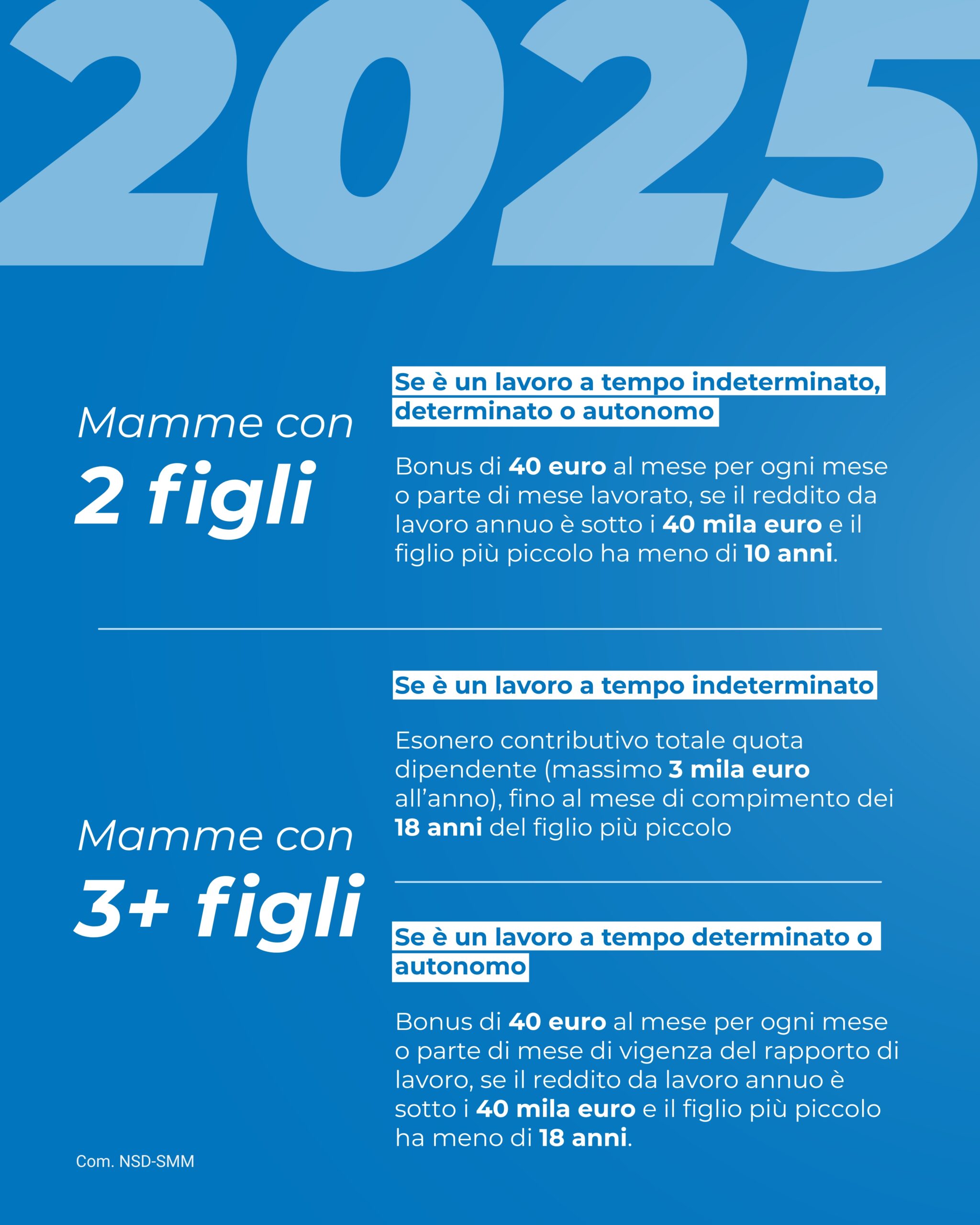 Per il solo anno 2025, in attesa dell’entrata in vigore delle nuove modalità di decontribuzione previste dalla legge di bilancio, è stato previsto un bonus ponte per le lavoratrici madri con 2 o più figli, con reddito da lavoro entro 40.000 €/anno.