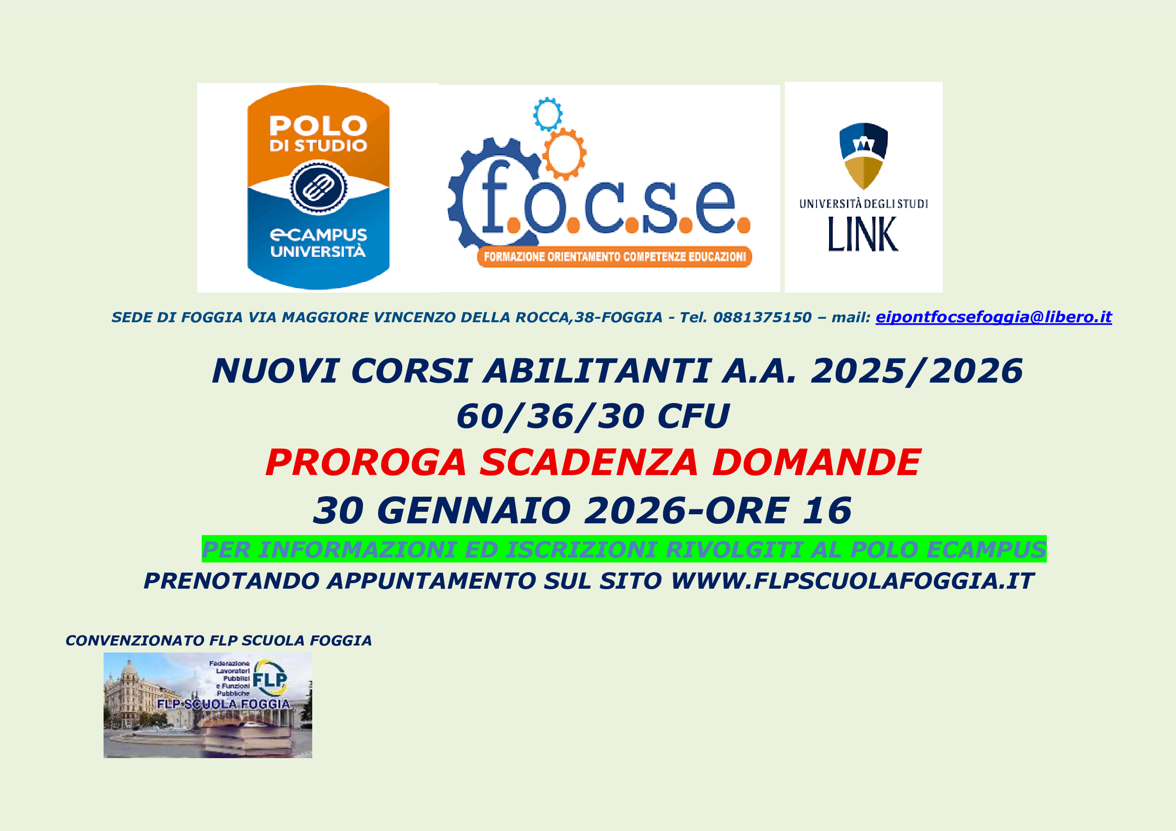 IN VIRTU’ DELLA CONVENZIONE CHE QUESTA SEGRETERIA PROVINCIALE HA STIPULATO CON IL POLO DI STUDIO FOCSE FOGGIA- DELL’UNIVERSITA’ LINK-CAMPUS, TUTTI COLORO CHE SONO INTERESSATI A PRODURRE DOMANDA ED EFFETTUARE LA RELATIVA ISCRIZIONE AI CORSI, POSSONO RECARSI PRESSO QUESTA SEDE PRENOTANDO APPUNTAMENTO CLICCANDO IL SEGUENTE LINK:
